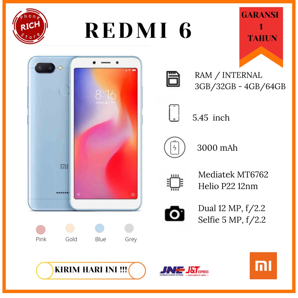 Harga XIAOMI REDMI 6 3GB/32GB, 4GB/64GB FULLSET GARANSI saat ini masih murah hanya Rp. 967.000,00, kita tidak akan pernah tahu tentang Harga ini di masa depan, juga stok barang ini nanti atau besok hari, bisa saja harganya naik tinggi atau bisa juga stok sudah Habis.
