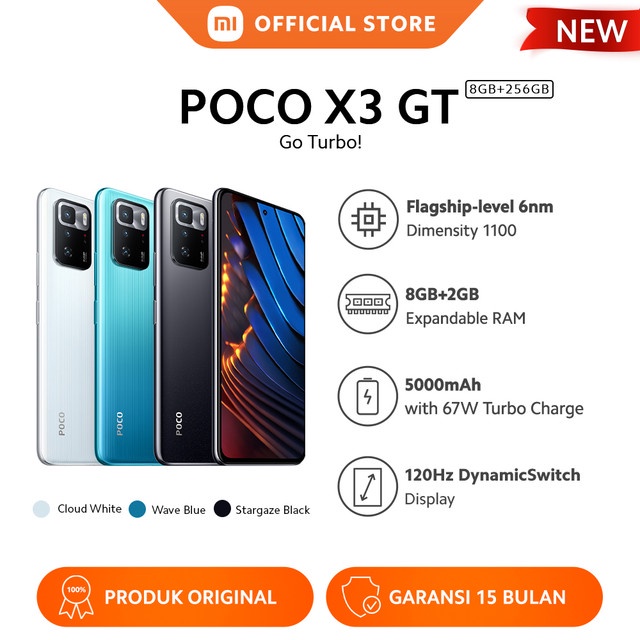 POCO X3 GT 8GB+256GB 6nm Dimensity1100 64MP Triple Kamera Layar DotDisplay FHD+ 6,6� 120Hz 5000mAh
